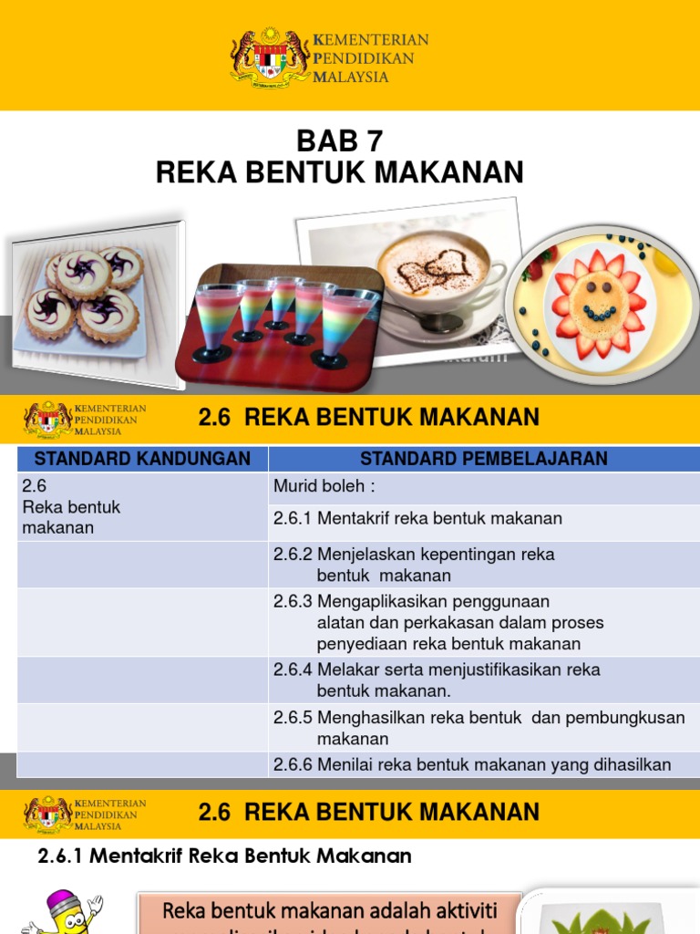. PENGUASAAN 26 Rekabentuk Makanan 1 Menyatakan maksud dan kepentingan reka bentuk makanan 2 Menerangkan kategori alat dan perkakasan dalam proses reka bentuk makanan 3 Melakar reka bentuk makanan 4 Menganalisis kesesuaian elemen dan prinsip dalam lakaran reka bentuk makanan 5 Menjustifikasikan pemilihan elemen dan prinsip dalam reka. Penerangan ringkas mengenai Reka Bentuk Makanan dan Pembungkusan bagi mata pelajaran Reka Bentuk Teknologi Tingkatan 2. Pembungkusan perlu menepati beberapa sifat.